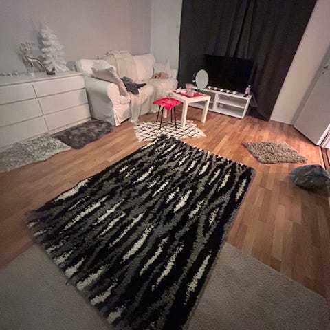 Korkeanukkainen, lämmin, pehmeä ja kaunis matto etsii uutta huonetta valloitettavaksi. Nouto ja käteismaksu, kiitos.