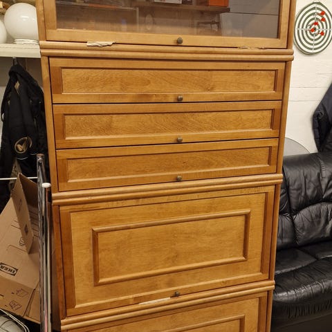 Myydään hyväkuntoinen hyllykkö. Salasokkeli ja laatikosto (39cm syvä), laatkko ja kaksi lasiovellista hyllyä (30cm syvä). Kokonais korkeus 159,5cm.