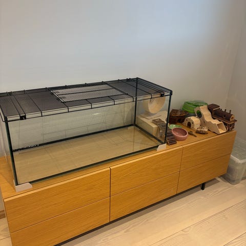 Terraarioiden päädyistä poistettu levyt ja aukko korvattu verkolla. Päädyn levy haljennut toisesta terraariosta kiinnityksen takia. Mukaan saa kaikki osat - myös ne, joilla terraariot olleet toisissaan kiinni.