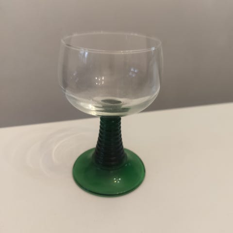 Kaunis muotoilu jalassa, lasi siinä tumman vihreää. Korkeus lasilla 12,5cm