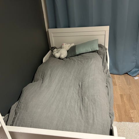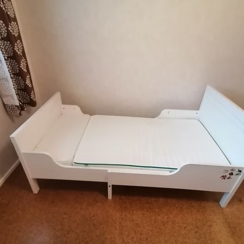 IKEA Busunge jatkettava lastensänky. Sänky on vaaleanpunainen ja sen pituutta voi säätää. Kuvissa näkyy käytön jälkiä ja naarmuja sängyn pinnassa. Eivät vaikuta käyttöön.