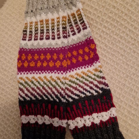 7veljes langasta kirjoneuleella neulotut säärystimet