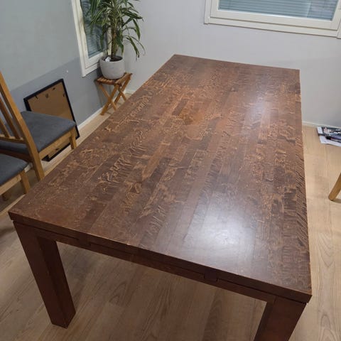 Koivu ruokapöytä. Stemmasta Kaisla niminen. Kohtalainen koska käytön jälkiä löytyy. Ei mitään isompaa mikä haittaisi silmää. Nouto Jäälistä.