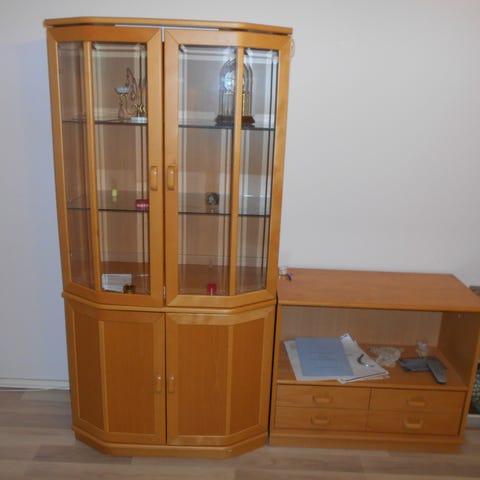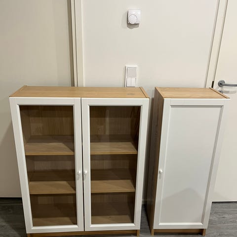 Ikea havsta vitriinikaappi+alakaappi+sokkeli. Käytönjälkiä löytyy. Lasilevyt siistit.