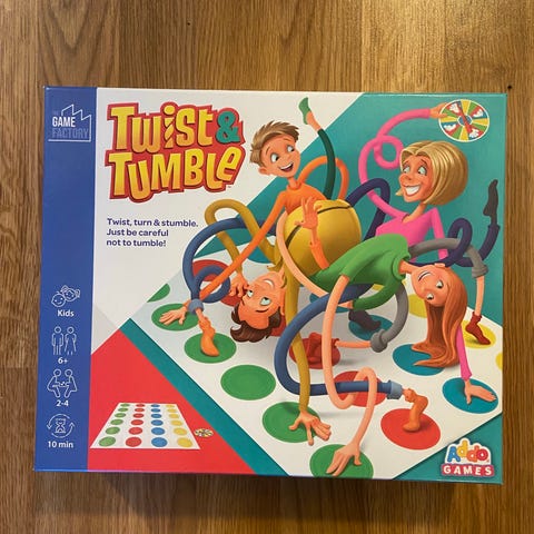Hasbro Twister lautapeli, jossa pelaajat asettavat kädet ja jalat värillisille pisteille pelilaudalla. Sopii yli 6-vuotiaille, kehittää ketteryyttä ja tasapainoa.