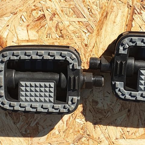 Käyttämättömät polkimet. Pinnassa karkea kuviointi, jossa kenkä pitää hyvin. 12 mm kierre.