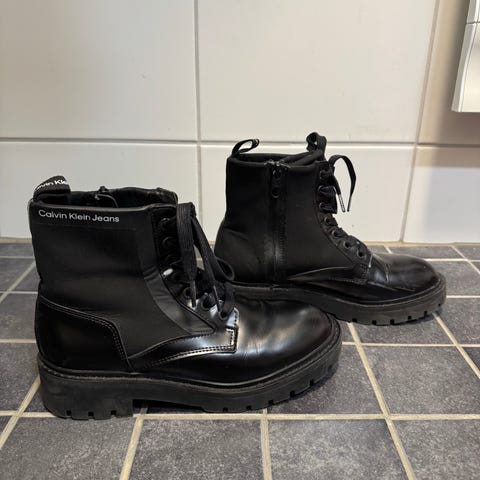 Calvin Klein vähän käytetyt nahka-/kangasmaiharit, koko 39. Värinä vaalea beige. Vetoketju sivussa. Ei vuorta. Chunky combat laceup zip. Joustavassa kankaassa haaleita, pieniä tahroja ja toisen kengän kärjessä pieni naarmu. Myynnissä muuallakin.