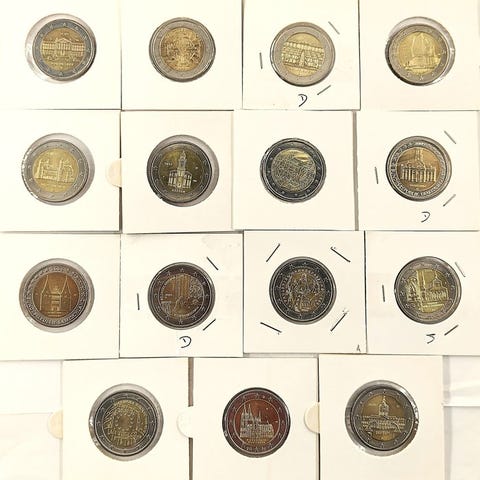 Erä 15 x 2 euron kiertäviä muistomitalirahoja.