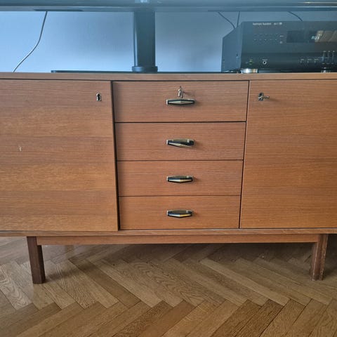 Myyntiin upea teak lipasto/hylly. Helposti saa kasaan ja mahtuu hyvin henkilö autoon. Ainoa miinus on isomman oven alakulma on hieman ottanut osumaa, mutta ei ole itseä häirinnyt. Laitoin kohdasta kuvan.