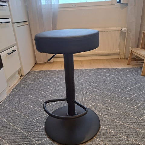 Musta baarituoli, joissa on kromatut jalat ja jalkatuki. Takana selkänojassa on naarmuja ja käytön jälkiä. Sopii baaritiskin tai keittiösaarekkeen ääreen. Säädettävä korkeus.