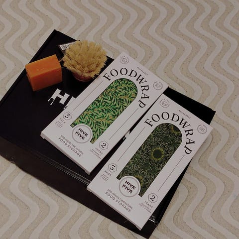 Kolme mehiläisvahakelmua. Toinen paketti avaamaton (koko 32 x 32 cm), toinen avattu ja kelmuja käytetty kerran jonka jälkeen pesty.