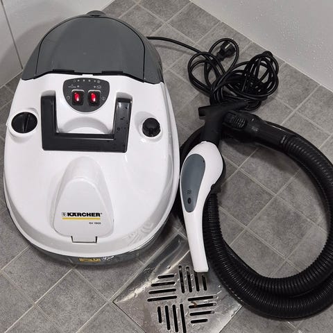 Tässä isommankin siivousurakan avuksi tehokas laite runsailla varusteilla. Vain moppiliina puuttuu.
