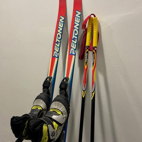 Madshus-merkkiset sukset, pituus 120cm, pitopohja. Rossingnol-merkkiset sauvat 85cm ja monot, kokoa 31 NNN-mallin pohjalla.