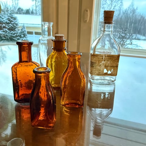 Viisi apteekin pulloa joista kolme ruskeita kaksi litteitä kirkkaita. Korkein ruskea 20 CM, seuraava 18 senttiä ja kolmas 18 senttiä. Kirkas lasipullo 23 senttiä ja 20 CM. Lisäksi yksi ruskea purkki. Myydään kaikki yhteishintaan 35 €
