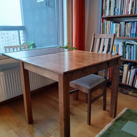 Kotiinkuljetus mahdollinen pientä lisämaksua vasten. Ruokapöytään saa jatko palan jonka leveys 44,5cm. Tuoleissa on hieman käytön jälkiä mutta ovat täysin ehjiä.