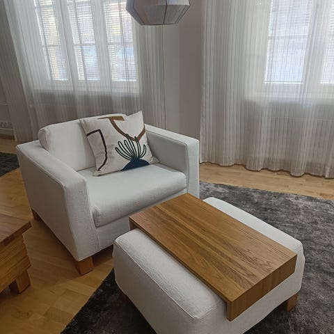 Muuton tieltä nojatuoli ja rahi uuteen kotiin.