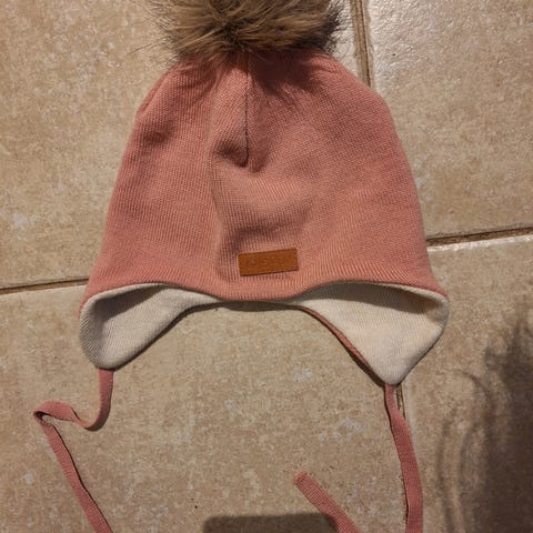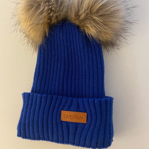 Gugguu vaaleanpunainen merinovillainen pipo kahdella tupsulla, koko L eli vastaa kokoa 54.
