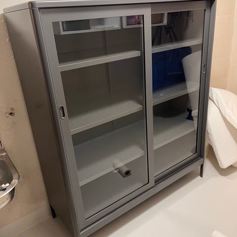 Havsta vitriinikaappi, valkoinen, 121 x 35 x 123 cm. Vasemmassa päädyssä ollut pieni naulakko, josta jää ruuvinreiät. Muuten on siistissä kunnossa.