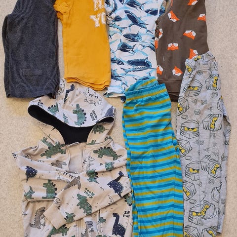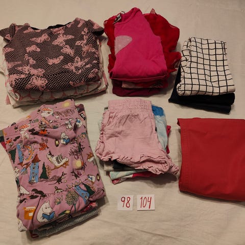 Lasten vaatepaketti, koot 98-100cm, kissakoti. 5kpl huppareita/neuleita, 5kpl shortseja, 5kpl pitkähihaisia paitoja, 5kpl t-paitoja ja kahdet housut.