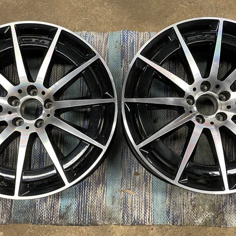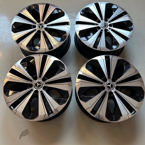 Lähes priimakuntoiset alkuperäiset EQC:n vanteet kesärenkailla. Päällä renkaina Pirelli Scorpion Verde, rengaskoot 2kpl 255/45/R20 ja 2kpl 235/50/R20, kunto hyvä, pintaa keskimäärin 7mm. Painotukset tehty fiksusti mustilla paínoilla mustan sisäosan vuoksi. Painetunnistimet paikallaan.