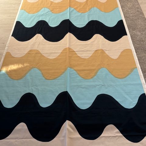 Marimekon Lokki-kangas, 100%puuvillaa. Väreinä oranssinpunainen, vaalea minttu, vaaleanruskea ja vaalea roosa. Leveys 145cm ja pituus 138cm.