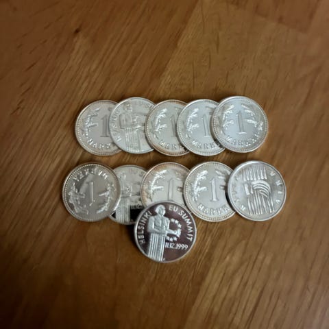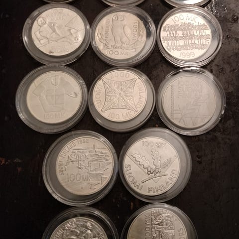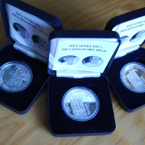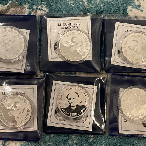 Kymmenen kolikkoa. Ylin rivi 830 ja loput 925 hopeaa. Erinomaisessa kunnossa.