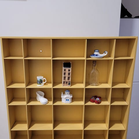 Puusepän valmistama tukeva ja painava lokerohyllykkö.