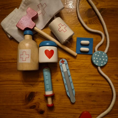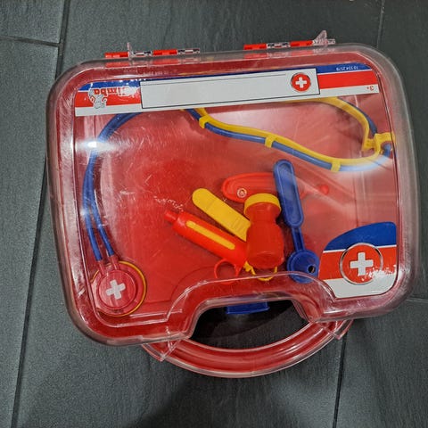 Monipuolinen setti lasten lääkärileikkeihin. Mukana myös oikea stetoskooppi.