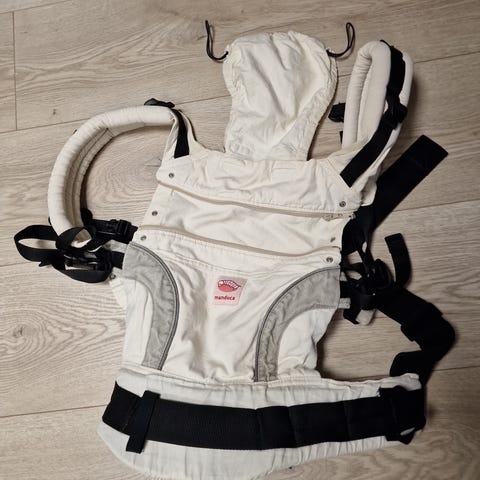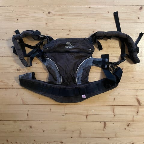 Vihertävän harmaa kantoreppu. Väri haalistunut, mutta toiminnallisuudet kunnossa.