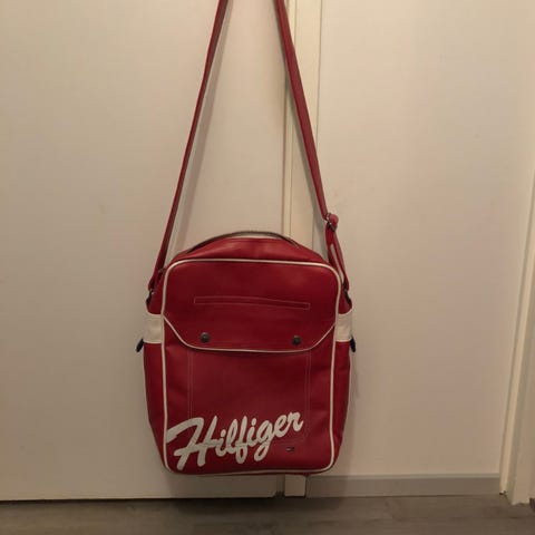 Värikäs, pieni, ruudullinen, säädettävä olkalaukku Tommy Hilfiger New York 1985. Edessä yksi ja sisällä kaksi avotaskua ja sisällä myös yksi vetoketjullinen tasku. Korkeus 19cm ja leveys 19cm. Nouto tai postikulut ostajalle.