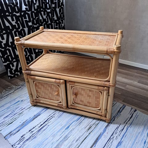 Rottinkikalusteet, pöytä ja kaksi tuolia