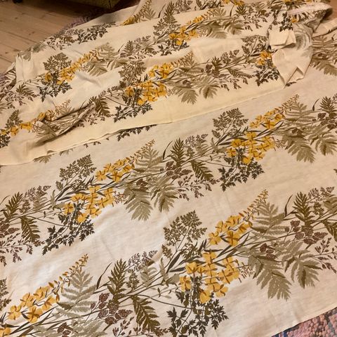 Myytävänä kaksi verhoa suoraan 70-luvulta. Verhojen pituus on 145cm ja leveys 105cm. Kangas on "eläväpintaista" puuvillaa.