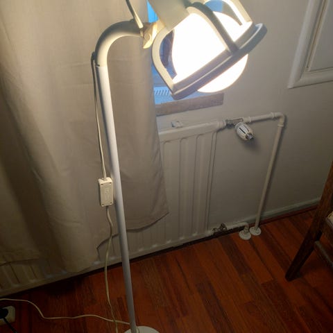 Jalkalamppu kolmella valaisimella. Voi säätää palavaksi joko yhdellä, kahdella, tai kolmella valaisimella kerrallaan.
