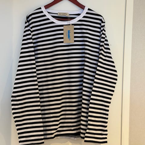 Myydään uusi Marimekon pitkähihainen paita Kioski Tasaraita väri sinimusta/ harmaa. Koko L.