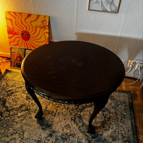 Myydään pieni pyöreä pöytä, jossa lasilevy päällä.