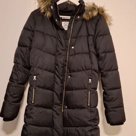 Hennesin lämmin toppatakki kokoa 170. Irrotettava huppu karvavuorella (karvavuori ei irrotettava), vetoketju ja tarrakiinnitys, hihansuissa resorit. Käytetty vain paristi ja kunto muutoin kuin uusi mutta takana nuppineulanpään kokoinen pieni reikä (katso kuvat), mikä huomioitu hinnassa.