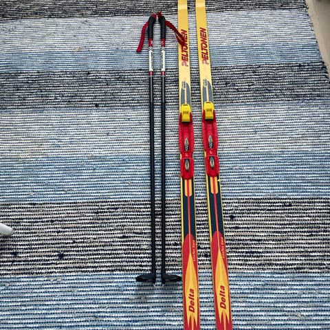 Myydään Peltosen lasten hiihtosukset (150 cm) SNS-siteillä ja sauvat (105 cm).