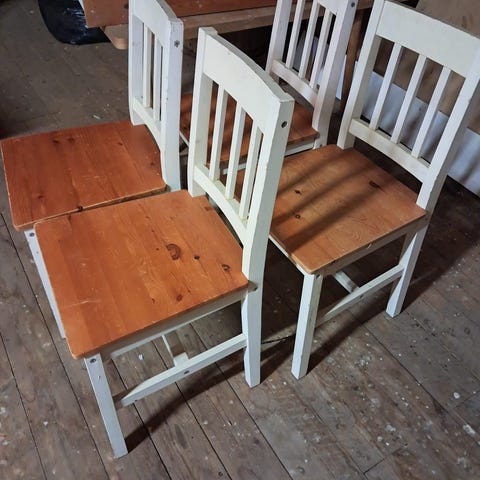 Annetaan valkoinen ruokailuryhmä. Pöydässä pinnassa jälkiä/hilseilyä, vaatinee pöytäliinan tai tabletit. Tuolit käytetty kunto, harmaat pehmeät istuinosat