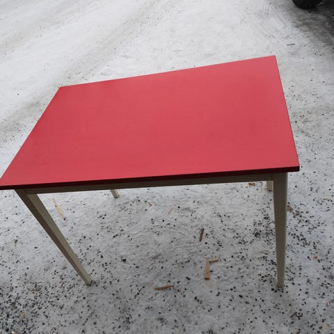 Kolmio mallinen pöytä kuten kuvassa näkyy pyörät ja jalat alla myös veto laatikko alapuolella
