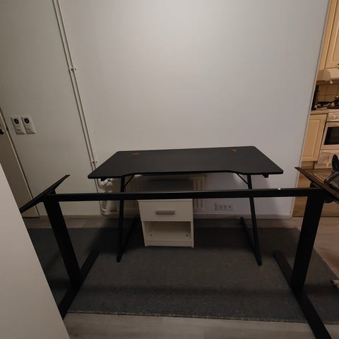 Pöytä ja jalat 4kpl. Jalkojen korkeus säädettävissä. Mukaan myös kiinnikkeet, joilla pöytä kiinnitettävissä esim kallax-hyllyyn viimeisessä kuvassa näkyvällä tavalla.