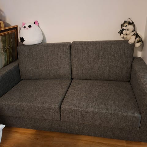 Sohvan kangas on sisäpuolelta vähän revennyt. Tämä näkyy vaan vuoteeksi levitettynä, ja silloinhan päälle laitetaan lakana, joten repeämä ei näy. Sohvassa on myös tahra, mutta sen saa varmasti pois tekstiilinpesuaineella.