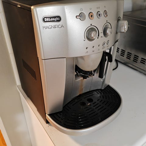 Täysin toimiva mini-erikoiskahvikone, joka tekee espressoa ja vaahdottaa maidon.