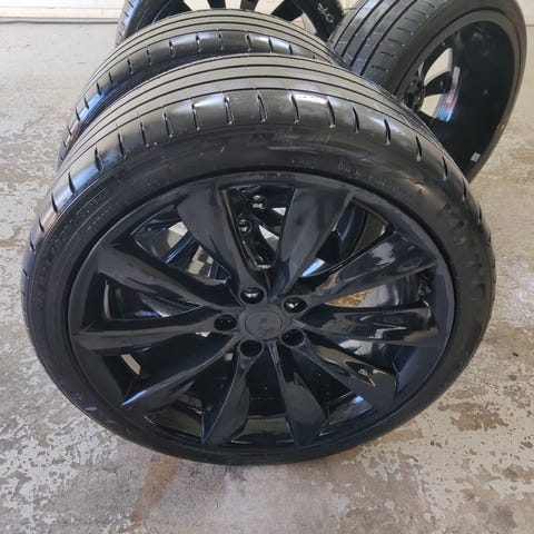 Teslan aidot performance mallin turbine sarja, eli leveämmillä takavanteilla. Matta antrasiitti. Hienot ja suorat, loistavat ajoltaan, mutta käytön jälkeäkin löytyy.