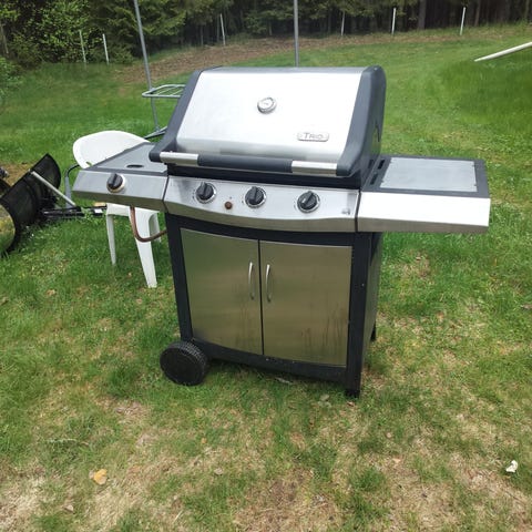 Kohtuulisen hyväkuntoinen kaasugrilli ikkunalla. Lämmönjakopellit kaipaa uusimista.