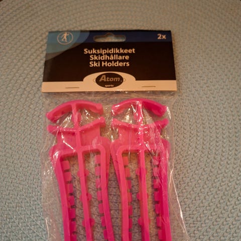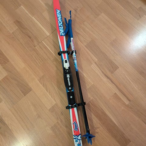 Hyvässä kunnossa vielä ensimmäisiä hiihtotestailuja varten. Sauvojen tarrat hieman repsottaa, voi varmaan ottaa irti tai teipata kiinni. :)