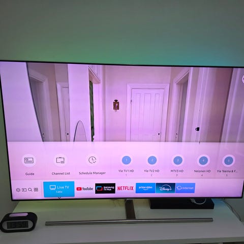 Ylimääräiseksi jäänyt 55" Qled tv ja Mozi Art lattiajalusta.