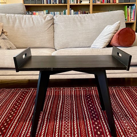 Neliön mallinen isku koivu sohvapöytä tai lastenpöytä. Mitat ovat pituus ja leveys 50cm.