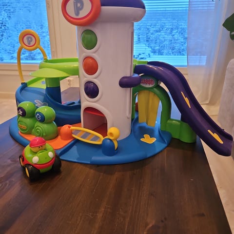 Parkkitalo autoilla. Katolla palikat ja avaimet joilla ovet saa kiinni/auki.