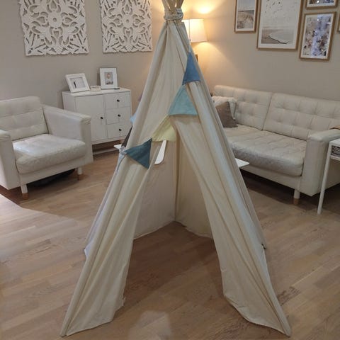 Lasten leikkiteltta puukehyksellä ja pilkkukuvioisella kankaalla