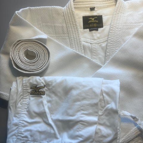 Lasten puku, koko 140, valkoinen väri. Puku koostuu takista ja housuista, tarkoitettu kamppailulajeihin. Materiaali vahvaa puuvillaa. Valmistajan (Meijin Budoshop) mukaan puku kutistuu pesussa 4%, joten lienee optimi 135cm pituiselle. Huom! Vyö ei sisälly!
